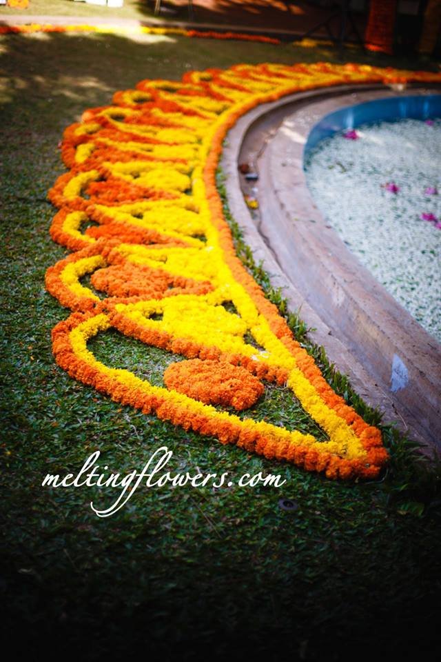 The pool area in this wedding venue has been adorned generously with flowers, mainly marigolds. Sprawling patterns of florals border the entire space around the pool.