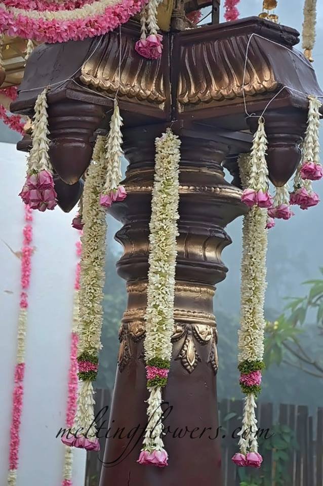 Small, dainty blooms strung together or in clusters make for stunning embellishments. Consider this entrance decor where the frame is covered in an intricate combination of flowers, some of which are also stuck on top of the bells hanging from the top. A stellar amalgamation of roses and jasmines in thick garlands can also be used in multiple ways for wedding decoration.