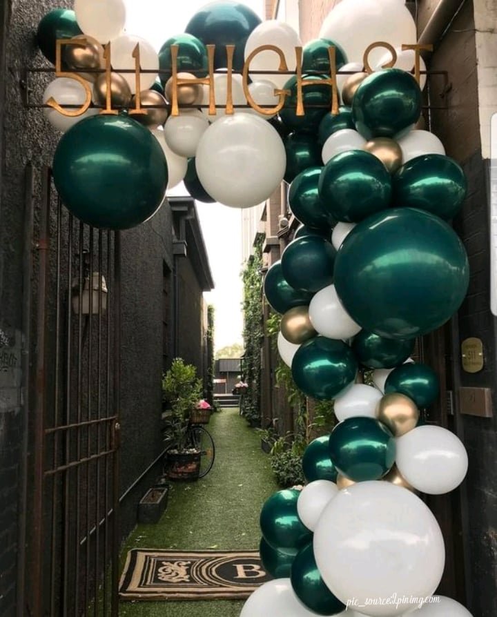 Balloons can most definitely be used for entrance and pathway decorations, as you can see below. The popular combination of black, white and golden is always a safe choice, and it can be paired with various other embellishments. Giant plain white balloons tied to streamers and tassels on both sides of a walkway also look lovely.