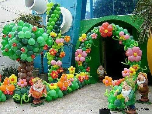 Take inspiration from nature for balloon-based decoration for the birthday. You can set up an entire balloon forest with colorful trees, shrubs and floral arches made of balloons for bigger venues. Entrances can be adorned similarly and given a particular theme with a few additions such as the little dwarf standees for a Snow White-themed decor. For smaller venues, a few stand-alone exotic flowers and fruits such as this bubbly pineapple are sufficient.