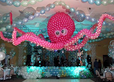 For an underwater theme party, use balloons to create aquatic plants and animals such as a giant octopus hanging from the ceilings. Use some transparent balloons hung about randomly to give the effect of bubbles.