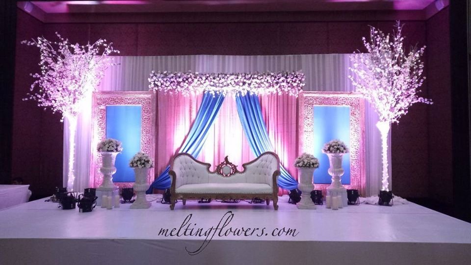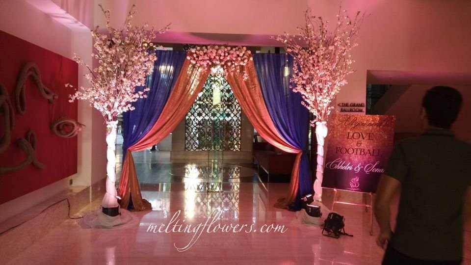 A sober backdrop decor that is a combination of blue and white drapes, adorned lightly with florals, makes for a beautiful reception stage. Drapes decoration can very well be used for entrances the same way too. Try pairing it with golden drapes for a richer feel.