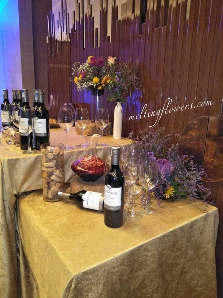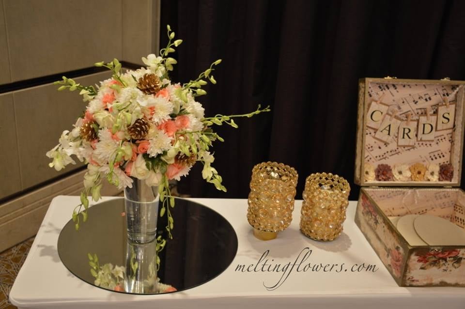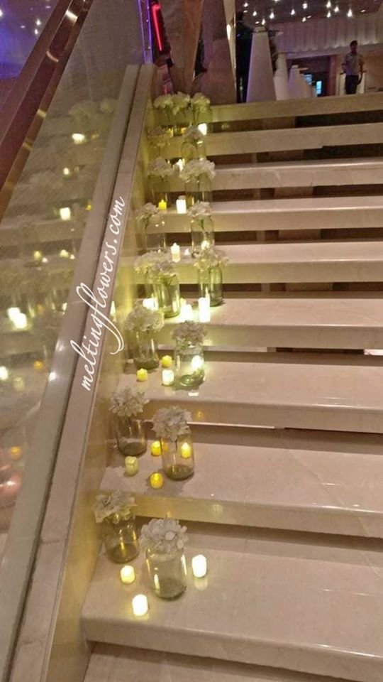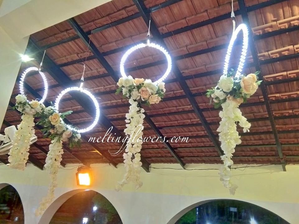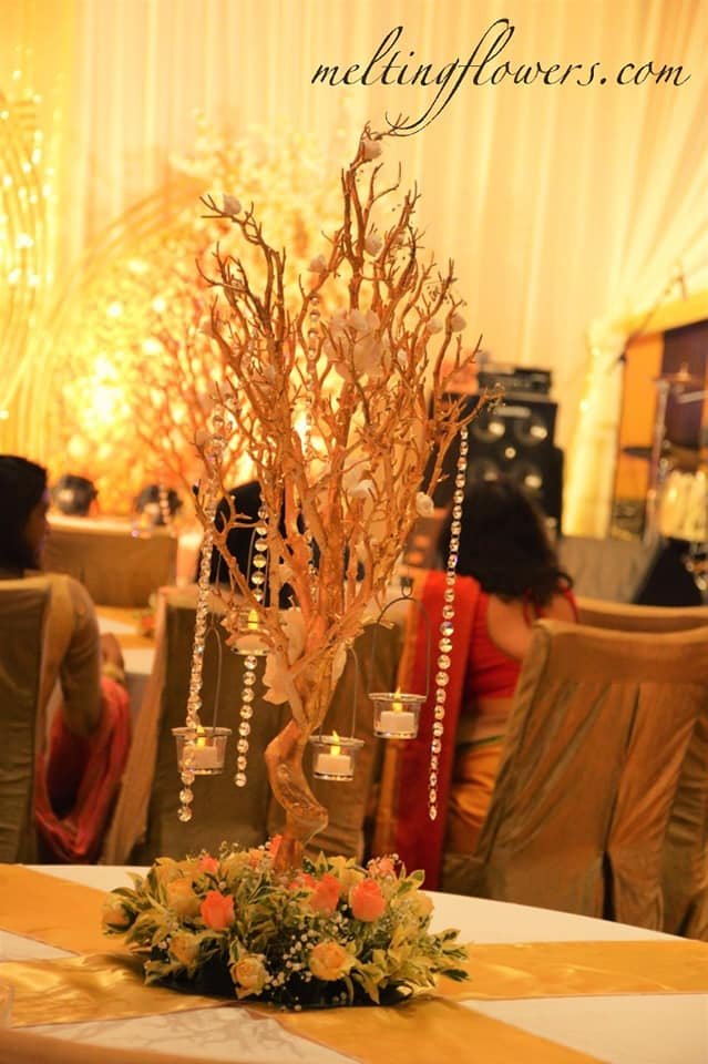 Eclectic, out-of-the-box combinations tend to become the highlight of the function. Keep bunches of a variety of florals in sleek metal and glass vases and complement the arrangement with various decorative items such as a gift box or crystal containers. A unique option is to have these rings of light adorned with pendant pastel blooms.
