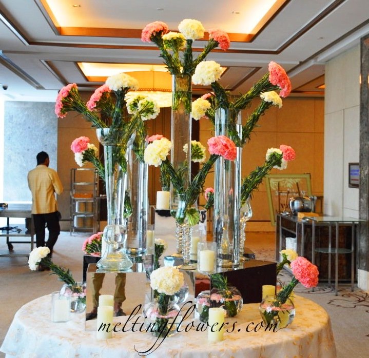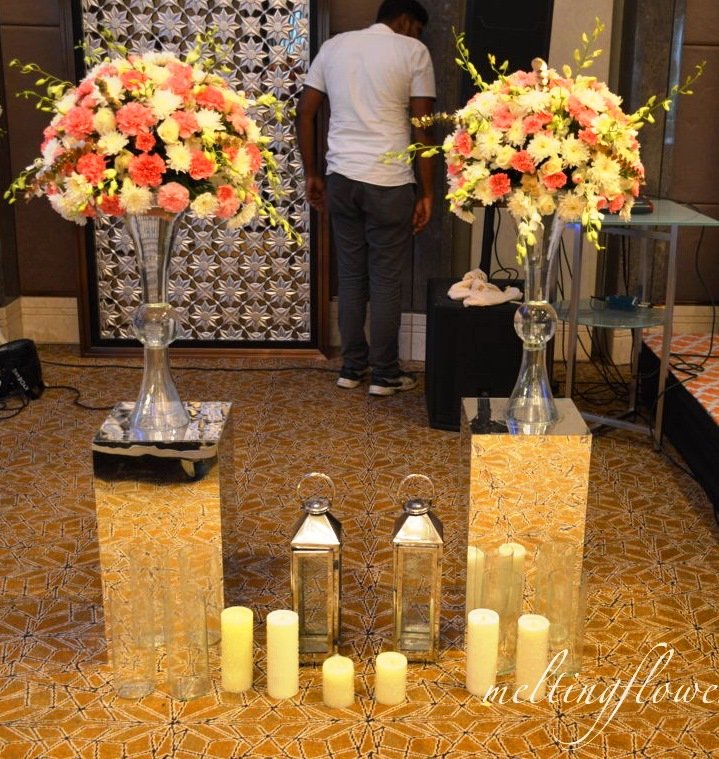 With its sleek glass embellishments and understated pastel flower decoration, this theme carries vibes that are quite perfectly suited to a cocktail party. The decor is such that it complements the suave interior of the venue and is used to only lightly accentuate it. It is best suited for engagements and receptions when you don’t really want overwhelming marriage decoration and are probably looking for budget-friendly options. These floral decorations are tasteful arrangements of lush flowers in slender vases with candles.