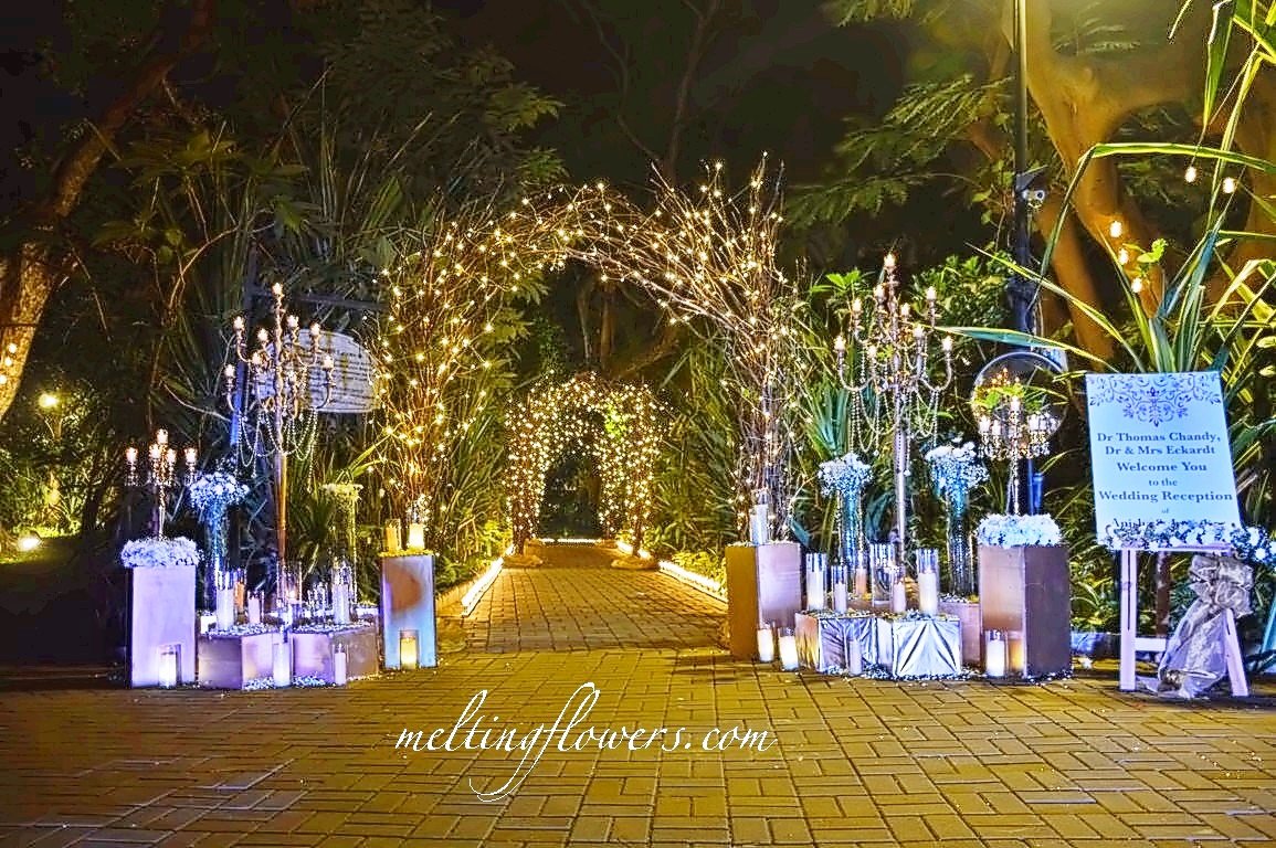 Light Me Up is a theme characterized mainly by lighting in various shapes and sizes. From flickering candles and string lights to gorgeous crystal chandeliers, various aspects of the decor incorporate these in backdrop, entrance and arch adornments to put a radiant twist to these common decorative elements. The highlight is the checkered stage backdrop that alternates between light blooms and chandeliers coming together in a mellow glow that is fitting for an intimate garden wedding.