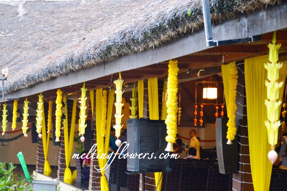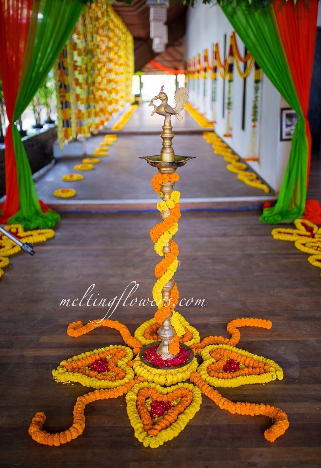 A picture-perfect daytime event, there’s an unforgettable charm to crisp, lush and vivid marigolds- the quintessential Indian wedding blooms, whether they’re hanging and swooping in arcs from ceilings and roofs or spread about on the floor in riveting floral rangoli for staircases and pathways.