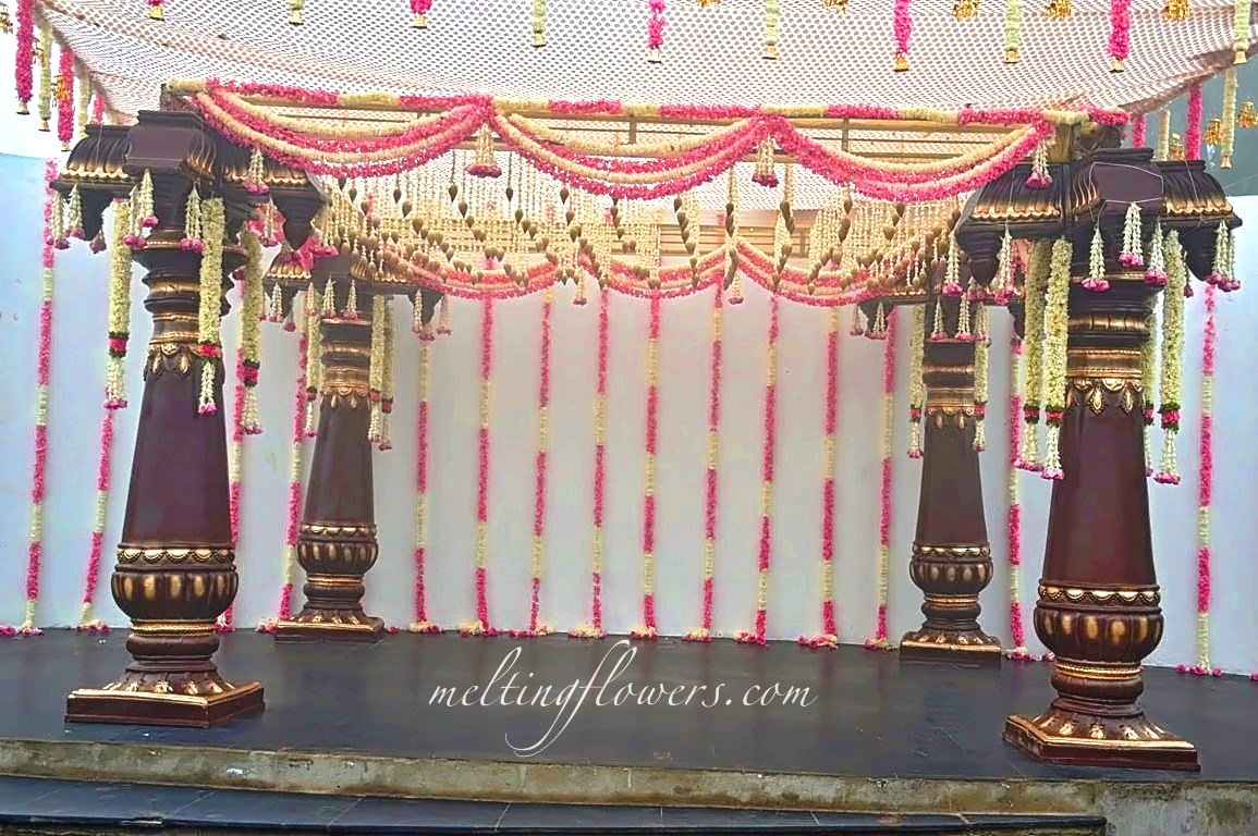 Pastel Sangam, as you can probably tell at a glance, is an influx of natural and fresh blossoms in the pastel color palette. While the hues are such that are incredibly fashionable in the present times, their incorporation and styling evoke an ethnic vibe. The magnificent combination of blush blooms in a traditional wedding stage decoration using wooden pillars generates a lovely contrast.