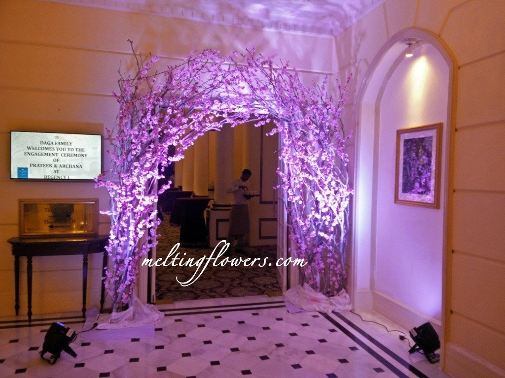 Floral arches and their variations are probably one of the easiest and most charming options for any kind of entrance decoration. They are versatile and work just as well for indoor venues, be it an inner entrance of a smaller size or a bigger one with a modern, glass interior. Lend them some intricacy by adding lanterns, crystal adornments, etc. and welcome your guests in style.
