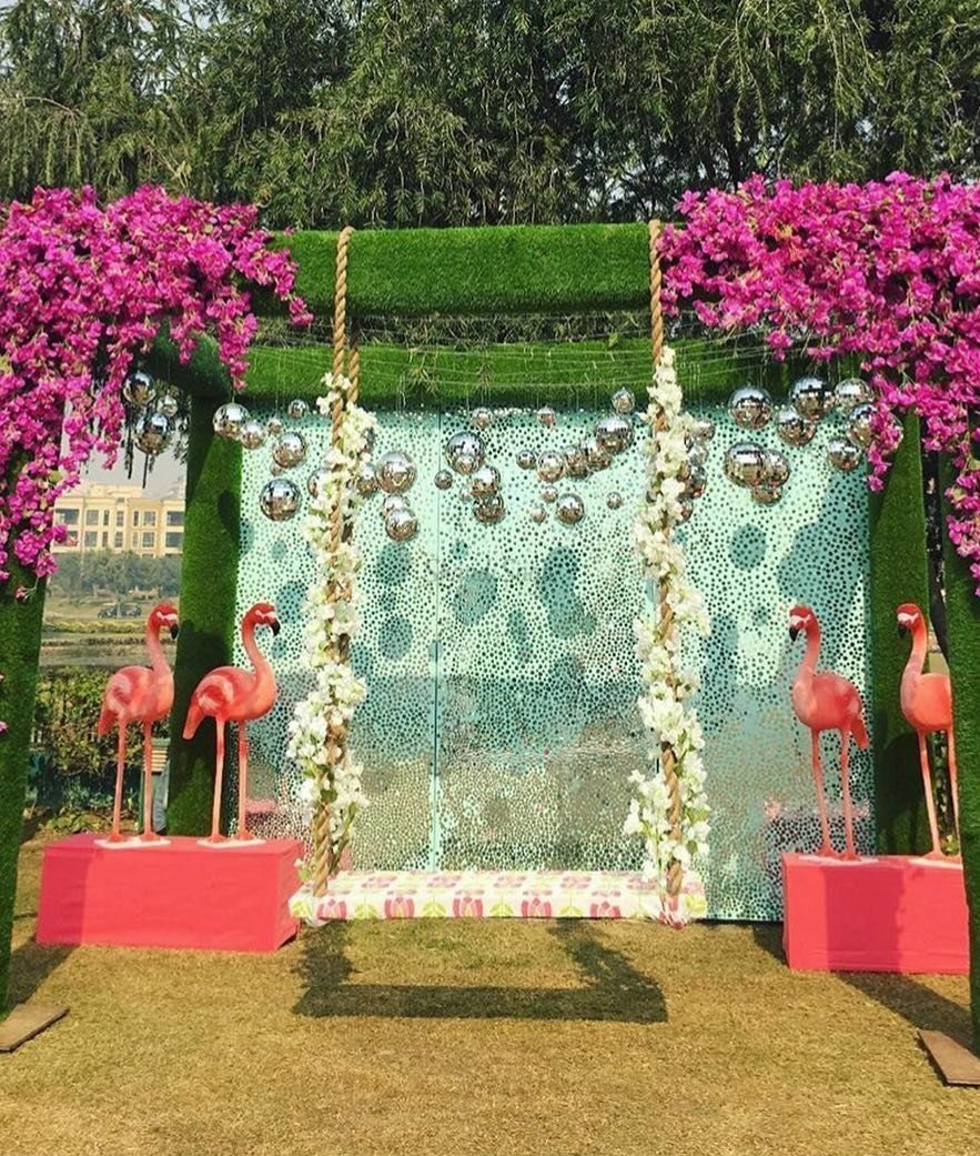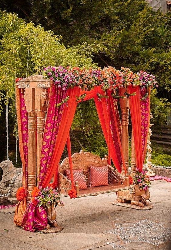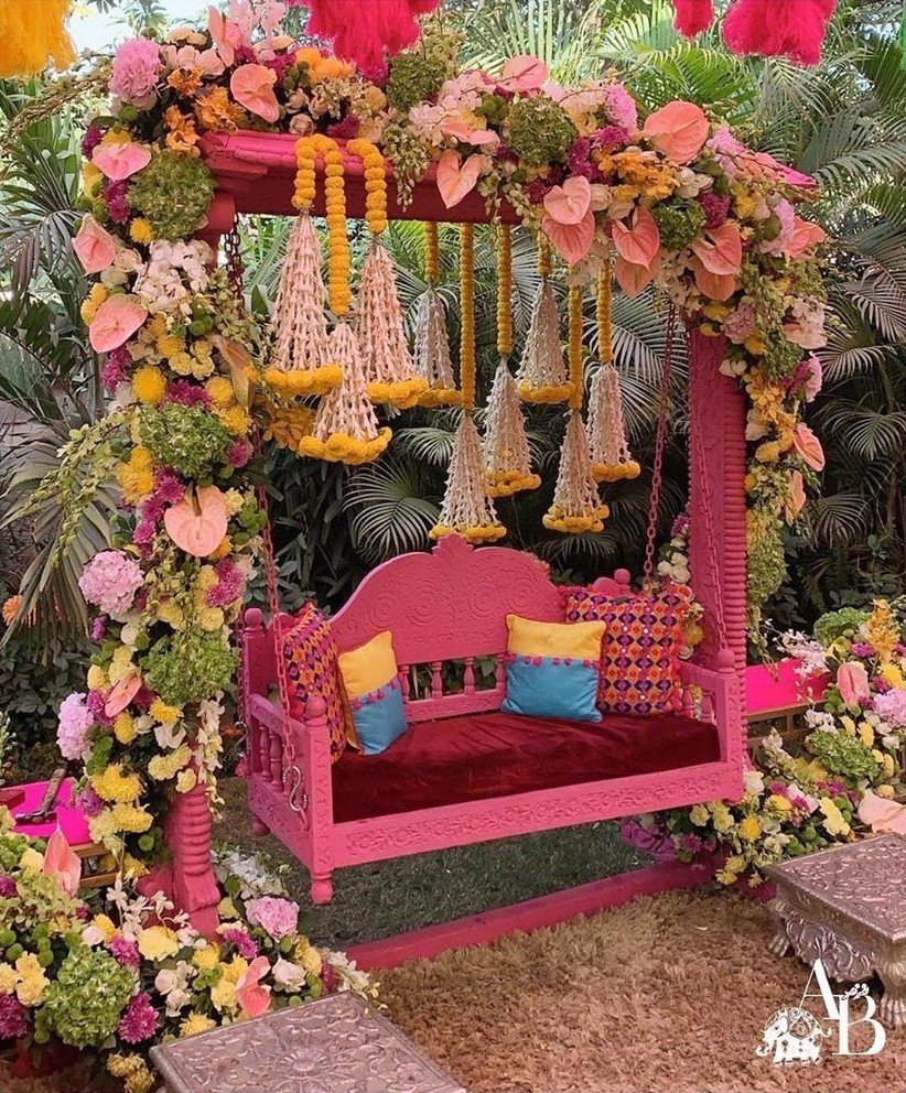 The usual marigold decor receives a modern makeover here with some vibrant and exotic floral additions, each one alluring in their own right. The swing set is a feast for the eyes and the colorful cushions truly amplify the quirky and trendy vibe.